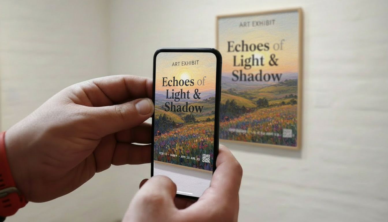 Within the Trace app, an artist creates an image anchor at the entrance to their gallery. When visitors scan this image anchor, all of the AR art on the walls and sculptures in the gallery appear around them.