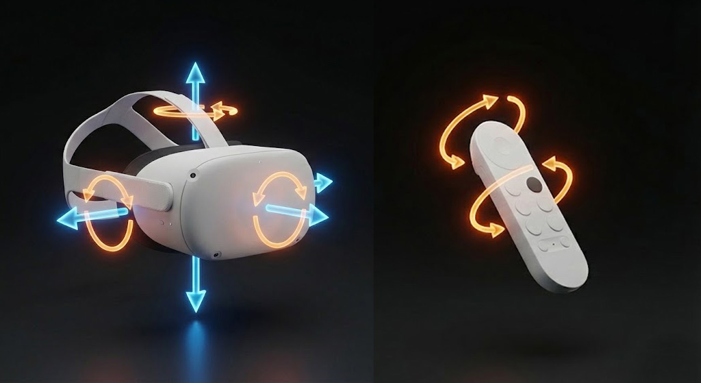 • 6DoF: Meta Quest controllers track their spatial position so a user can reach out and turn a virtual knob as if it were physically there.