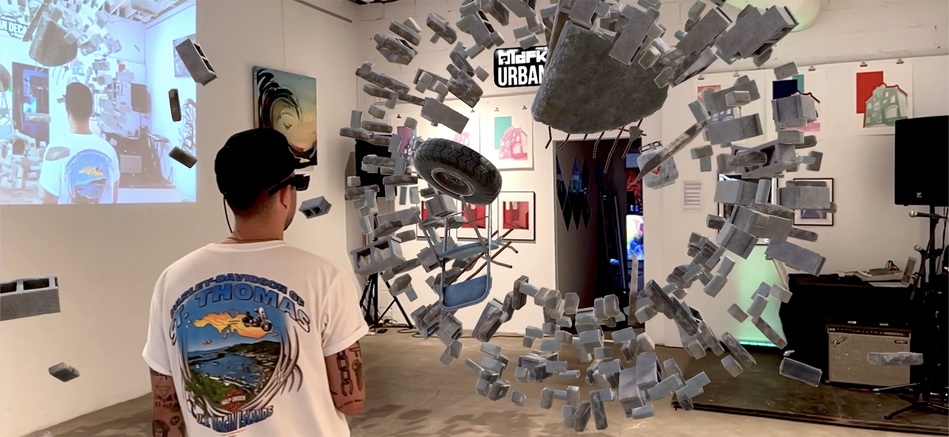 The exhibition, Urban Decay, explores the ever-changing nature of the modern city as it is continuously built up and simultaneously deconstructed. The AR installation is tied directly to the gallery space, allowing visitors to experience the piece through projection, phones, iPads, and even AR headsets.